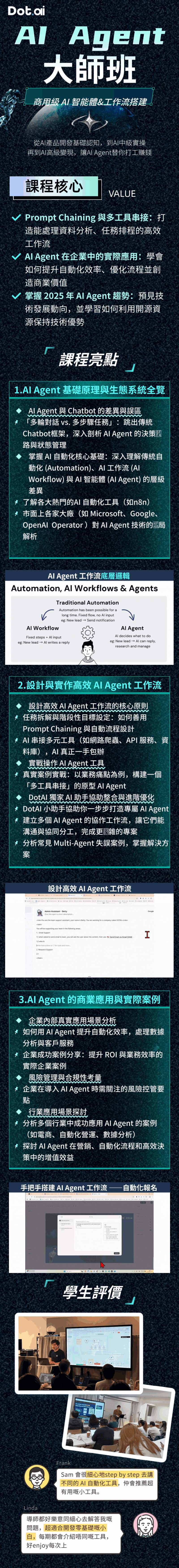 - 深入了解 AI Agent 在企業中的實際應用,學會如何提升自動化效率、優化流程並創造商業價值。