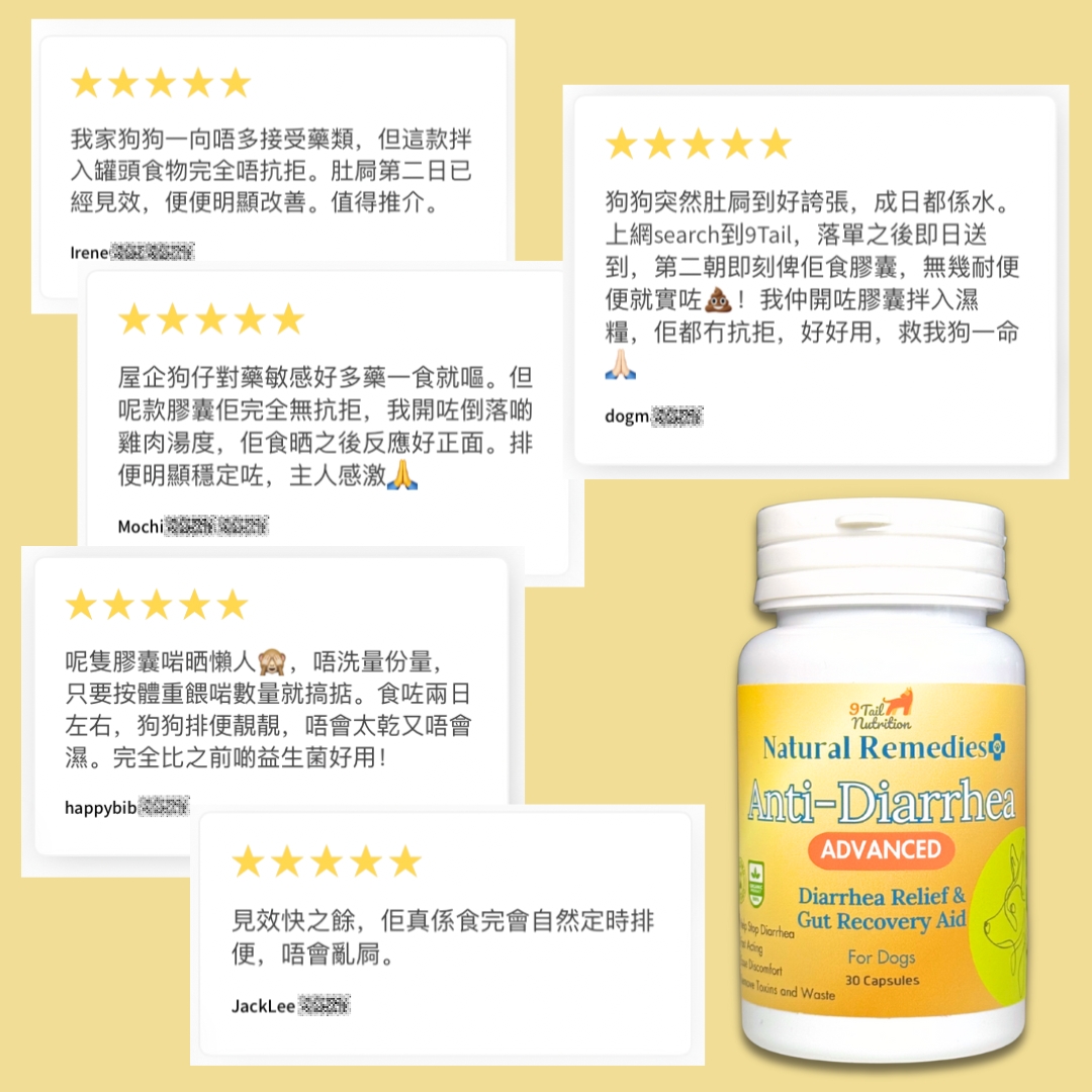 - 快速、溫和、有效 - 不會導致便秘或排便過頻,幫助狗狗恢復正常腸道節奏